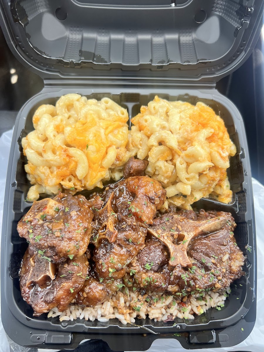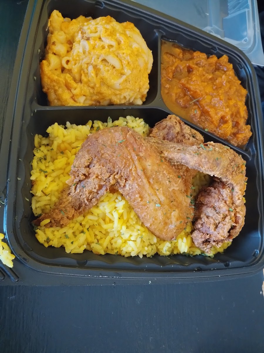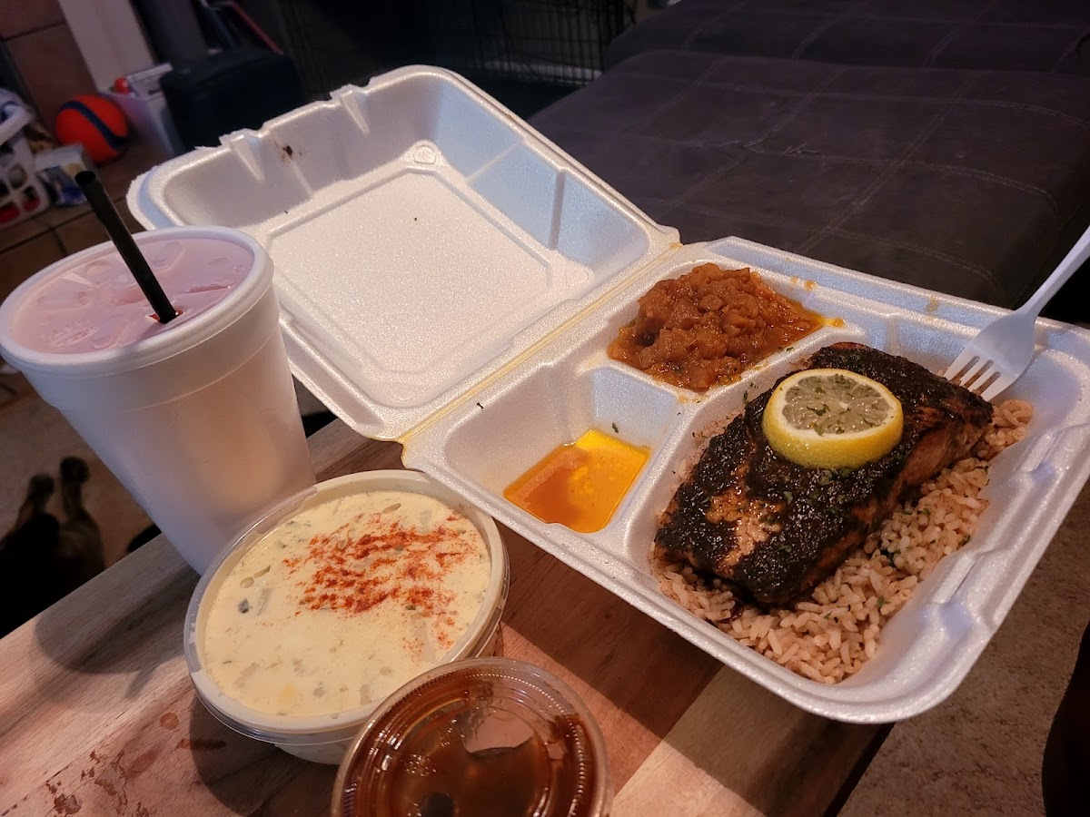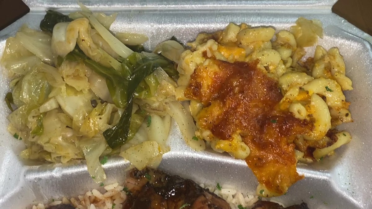 I ordered the Sweet Heat salmon with collard greens and cabbage. My Partner ordered Jerk Chicken with Mac n cheese and cabbage. Portion was very good. We enjoyed everything however my partner wasnt a fan of it the cabbage. We would go back